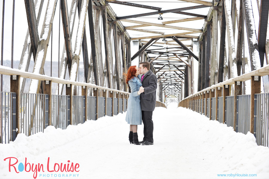 For their “engagement” session, we started out at the Walking Bridge in Quesnel, and oh how the wind howled down the river! It was already -13, and with the windchill, we didn’t last long at all!